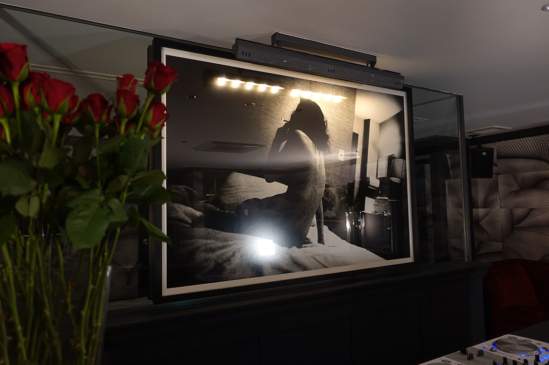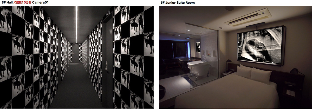 ※ 6Fのスイートルームはワンフロア全体を使った豪華仕様。網タイツの写真をグラフィカルかつアブストラクトに組み合わせた壁紙にProvoke 2からエロスをテーマとしたオリジナルプリント作品が怪しいムードを醸し出している。